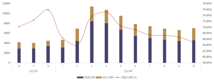 2023年10月份,经纪机构使用武汉经纪服务平台进行二手住房网签交易共4440笔,占同期二手住房交易总量的64.95%,网签交易量环比增加3.33%,同比增幅54.92%。网签交易占比环比收窄1.71%。