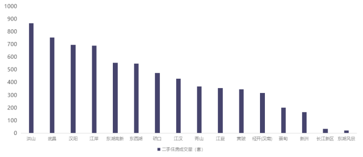 二手住房交易的活跃区域(江岸区、汉阳区、武昌区、洪山区、东湖高新区)共成交二手住房3566套,环比增加6.42%,同比增幅76.45%,占月度二手住房成交总量的52.17%,环比扩大0.17个百分点。