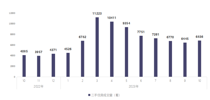 2023年10月,综合武汉经纪服务平台及各大经纪机构调研数据,全市二手住房交易6836套,成交量环比增加6.07%,同比增加67.34%。本月二手住房的交易量占到全市住房交易总量的40.45%,较上个月收窄8.56个百分点。