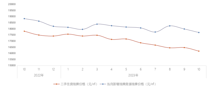 2023年10月,武汉二手住房总体挂牌价格为16179.78元/平,环比下跌1.75%。其中新增房源挂牌价格17698.97元/平,环比下跌1.60%。