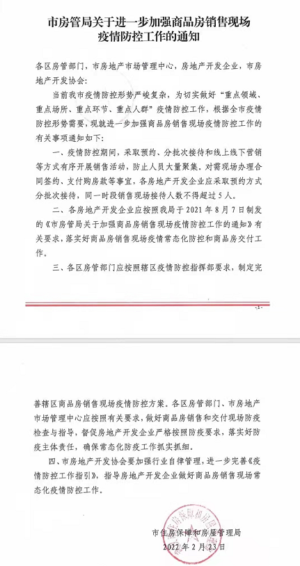 当前我市疫情防控形势严峻复杂,为切实做好“重点领域、重点场所、重点环节、重点人群”疫情防控工作,根据全市疫情防控形势需要,现就进一步加强商品房销售现场疫情防控工作的有关事项通知如下: