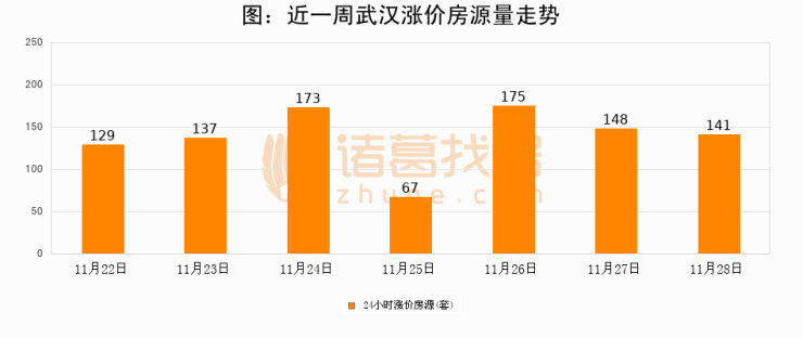 根据诸葛找房数据显示,武汉24小时涨价房源量为141套,较11月27日减少7套,环比下降4.7%。与此同时,涨价房源占比小幅回落,对于购房者来说是一个入市窗口期,购房者可抓住时机入市。