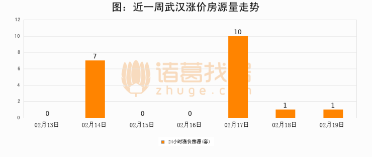 根据诸葛找房数据显示,武汉24小时涨价房源量为1套,较02月18日持平。