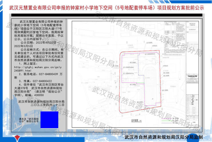 武汉元慧置业有限公司申报的钟家村小学地下空间(5号地配套停车场)项目规划方案批前公示。武汉元慧置业有限公司申报的钟家村小学地下空间(5号地配套停车场)项目位于汉阳区汉阳大道177号地块钟家村小学地下空间。
