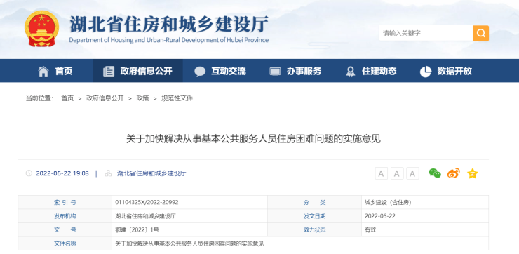 6月23日消息,搜狐焦点获悉,湖北省住房和城乡建设厅出台了《关于加快解决从事基本公共服务人员住房困难问题的实施意见》(以下简称《意见》)。
