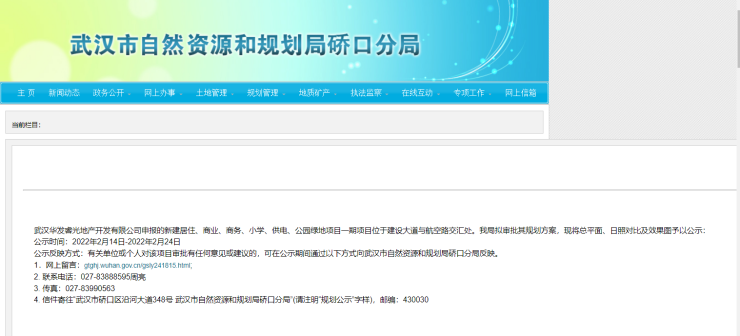 近日,据武汉市自然资源和规划局硚口分局发布《武汉华发睿光房地产开发有限公司申报的新建居住、商业、商务、小学、供电、公园绿地项目一期规划方案批前公示》。