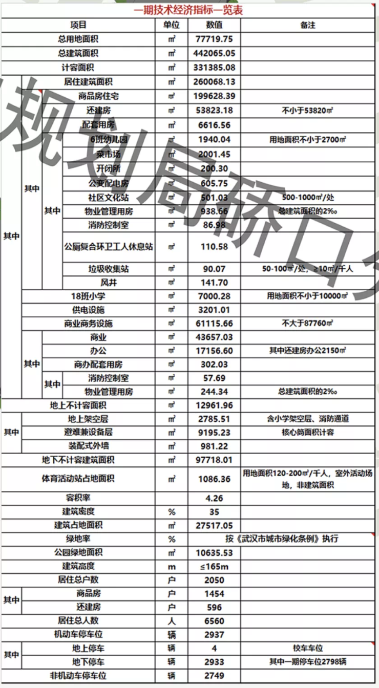 根据一期技术经济指标,总用地面积77719.75平方米,总建筑面积442065.05平方米,计容面积331385.08平方米,其中,居住建筑面积260068.13平方米,商业商务设施61115.66平方米,18班小学7000.28平方米,供电设施3201.01平方米。体育活动站占地面积1086.36平方米,公园绿地面积10635.53平方米。
