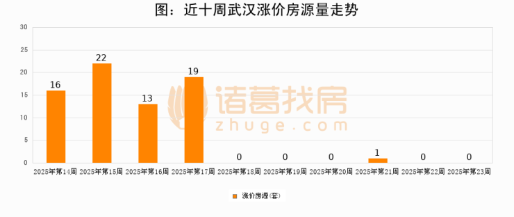 从调价房源来看,第23周武汉涨价房源0套,较上周持平。与此同时,23周涨价房源占比持平