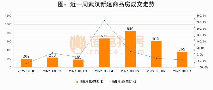 根据武汉市住房保障和房屋管理局数据显示,2025年08月07日武汉新建商品房成交365套,较昨日减少250套,环比下降40.6%