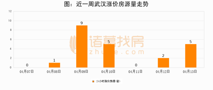 根据诸葛找房数据显示,武汉24小时涨价房源量为5套,较04月12日增加3套,环比上涨150%。与此同时,涨价房源占比小幅扩大,业主信心有所提升。
