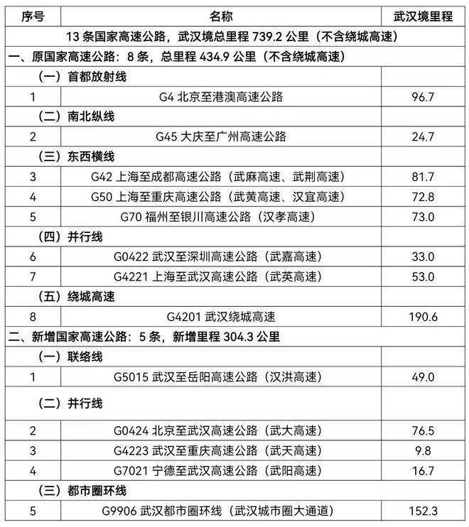 总计新增里程约304公里。新增的国家高速公路将重点补强武汉至东南、西南、北向的通道能力。