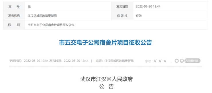 因公共利益需要,根据《国有土地上房屋征收与补偿条例》(国务院令第590号)、《湖北省国有土地上房屋征收与补偿实施办法》(湖北省人民政府令第380号)、《武汉市国有土地上房屋征收与补偿实施办法》(武汉市人民政府令第234号公布,武汉市人民政府令第275号修订)等相关法律法规规定,经江汉区人民政府研究决定批准市五交电子公司宿舍片项目范围内房屋予以征收,并下达江汉房征决字[2022]第2号房屋征收决定。决定对市五交电子公司宿舍片项目范围内的房屋实施征收,同时收回该范围内国有土地使用权。