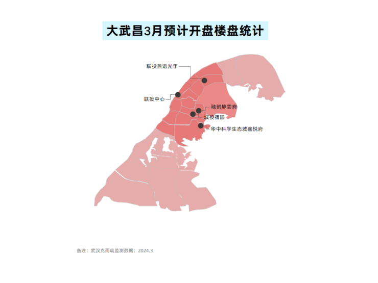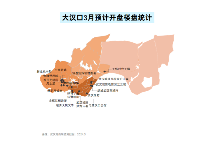 根据克而瑞监测数据,2024年3月,武汉市预计30个项目有供应,总供应量64.54万方,总房源5171套。其中6个为纯新盘,4个位于大武昌。