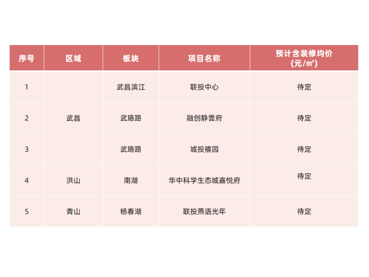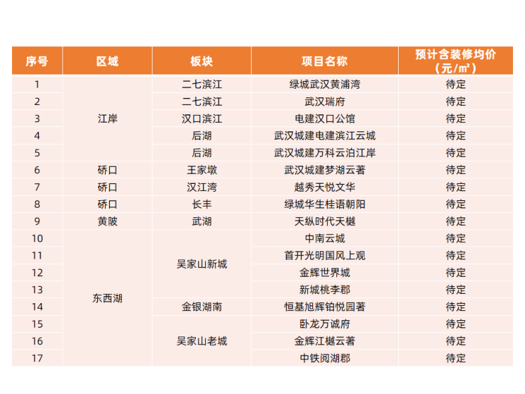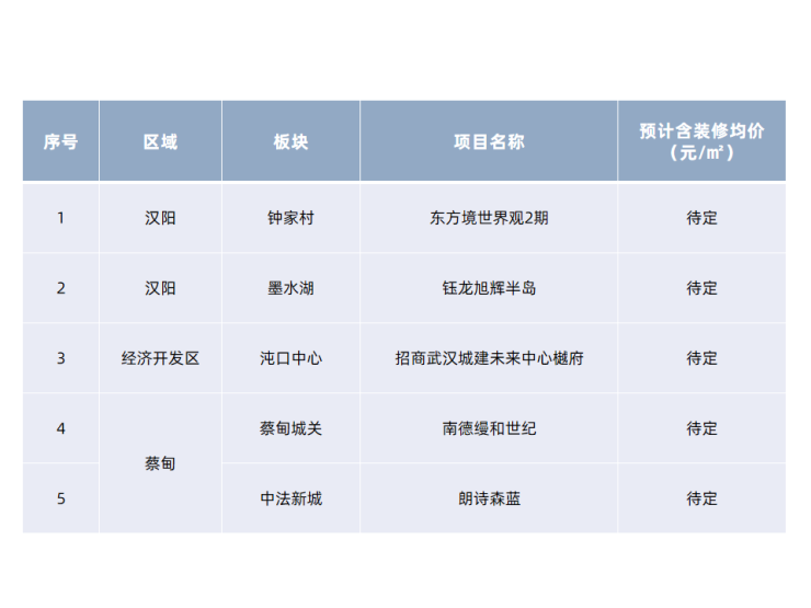 大汉口 3月预计17个项目有供应,总共2760套。其中东西湖区预计8个项目平推补货,供应量约1576套,市场竞争日趋激烈。二七滨江板块的武汉瑞府预计加推B地块8#超高层186-233㎡房源。汉江湾板块的越秀天悦文华纯新盘入市,预计3月初开放样板间,首开2#超高层108–143㎡三至五房。