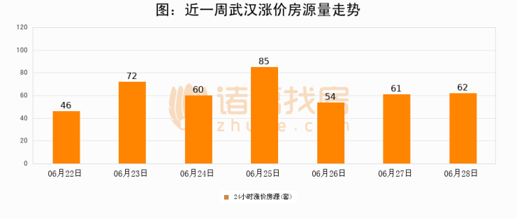 根据诸葛找房数据显示,武汉24小时涨价房源量为62套,较06月27日增加1套,环比上涨1.6%。与此同时,涨价房源占比小幅扩大,业主信心有所提升。