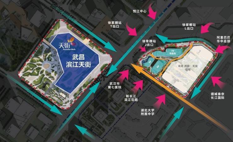 滨江天街作为滨江片区核心商业,以「城市品质颜选生活中心」的商业定位成为目前华中量级较高的「天街」系购物中心之一,未来将汇聚武汉三镇超千万的海量消费群体。滨江天街·铂金岛作为滨江天街的流量入口,与天街一起享有武汉优秀的交通、市政、人口等成熟生活配套。在这里,徐家棚5/7/8三线地铁交汇,将辐射超千万的庞大人流基数;千户大社区的包围,也为滨江天街·铂金岛提供了高端稳定的消费人群。人潮就是钱潮,抢占财富先机,滨江内环铂金资产再成投资大热门!