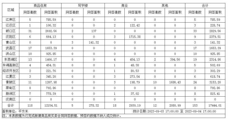 根据武汉市住房保障和房屋管理局数据显示,2023年9月4日武汉新建商品住房网签成交118套,较昨日(62)增加56套,环比上涨90%。