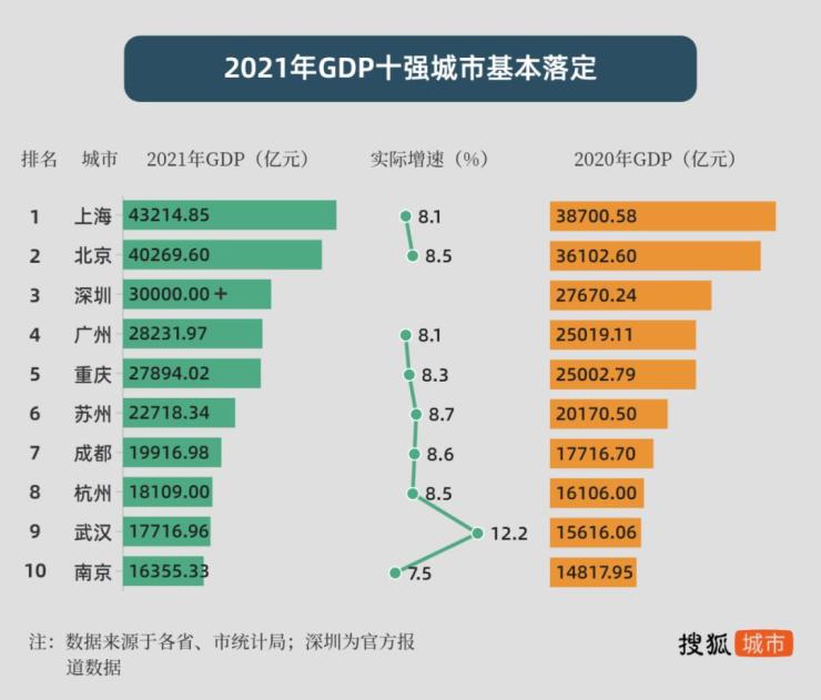 2021年,前十强城市排名没有变化,按GDP总量排名分别是:上海市、北京市、深圳市、广州市、重庆市、苏州市、成都市、杭州市、武汉市、南京市。