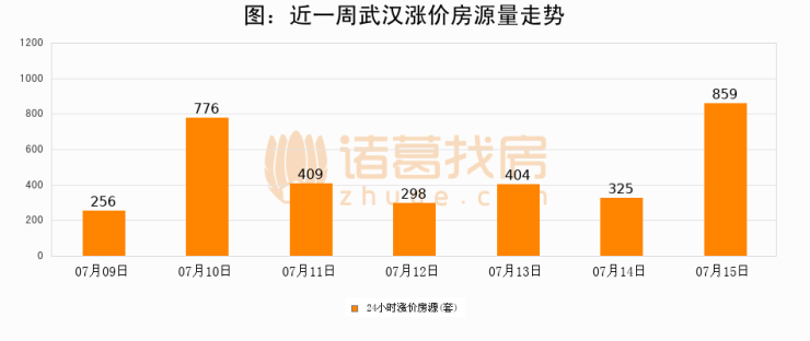 根据诸葛找房数据显示,武汉24小时涨价房源量为859套,较07月14日增加534套,环比上涨164.3%。与此同时,涨价房源占比小幅扩大,业主信心有所提升。