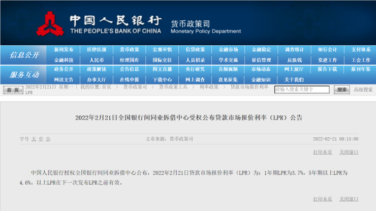 2月21日消息,新一期贷款市场报价利率(LPR)发布。中国人民银行授权全国银行间同业拆借中心公布,1年期LPR报3.70%,5年期以上品种报4.60%,维持不变。
