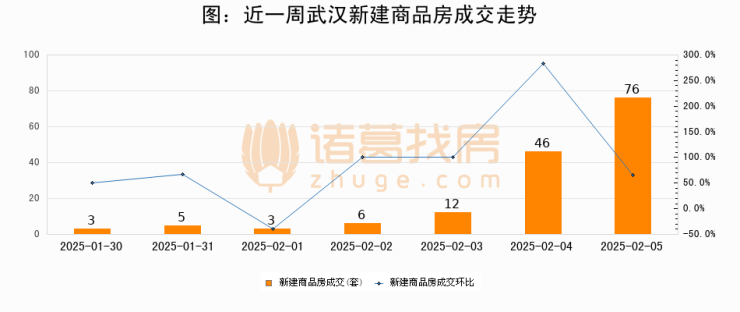 根据武汉市住房保障和房屋管理局数据显示,2025年02月05日武汉新建商品房成交76套,较昨日增加30套,环比上涨65.2%