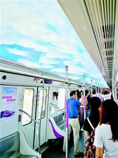 最让人眼前一亮的是,车厢内部照明采用顶部贯通“蓝天白云”的方案,让乘客仿佛置身于晴空之下。“这样的设计明亮、开阔,能让乘客不觉憋闷,乘车体验更加舒适。”乔红云说,“云苔紫”列车首次采用了LED照明系统,其能耗更低,比目前采用的荧光灯照明节能20%左右。