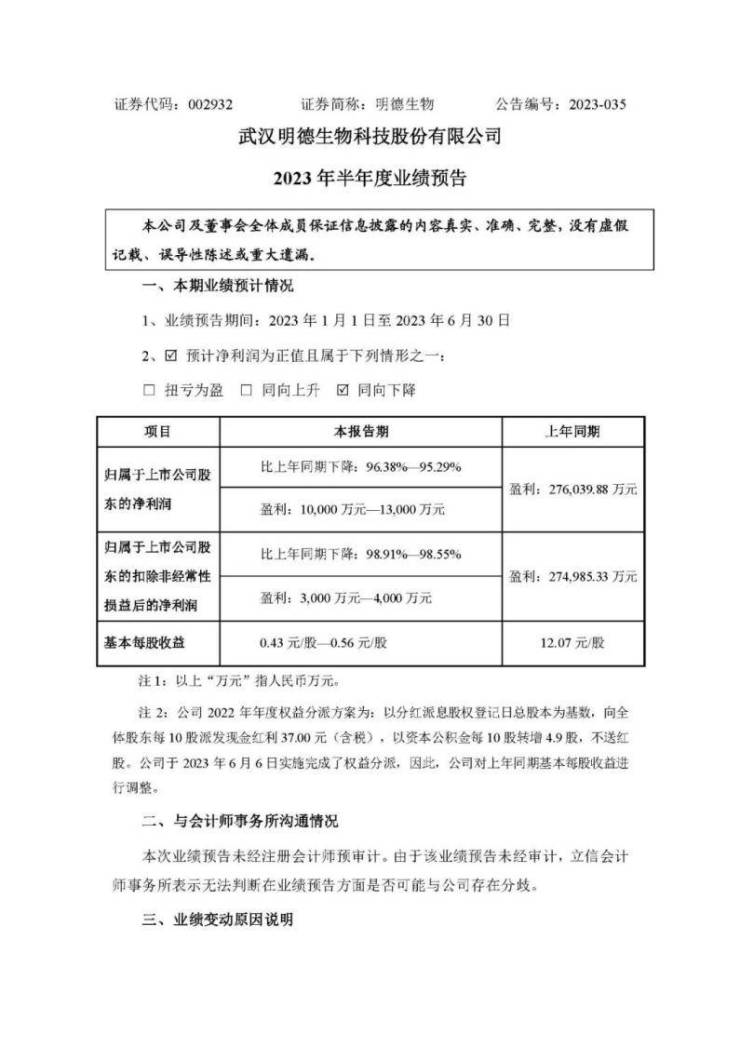 7月中旬,明德生物发布2023年半年度业绩预告,内容显示:归属于上市公司股东的净利润1亿元-1.3亿元,同比下降96.38%-95.29%;扣非净利0.3亿元-0.4亿元,同比降98.91%-98.55%。