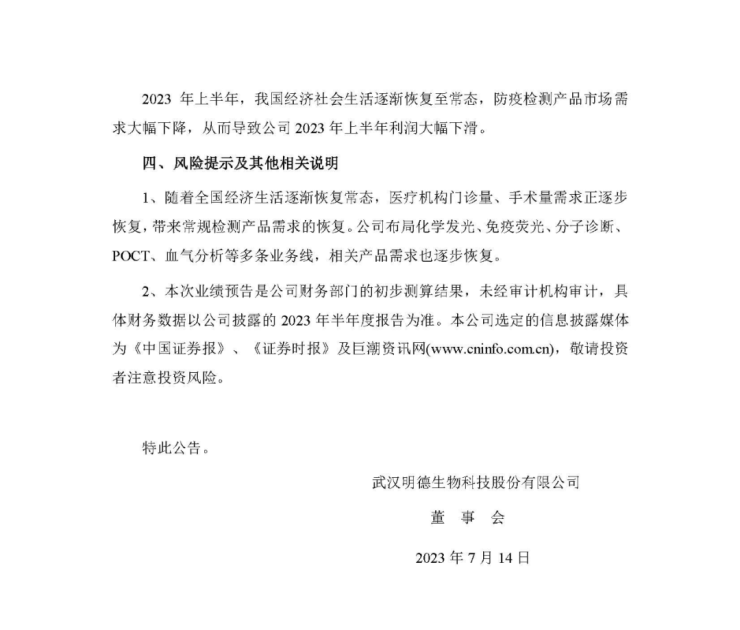 公告称,2023年上半年,我国经济社会生活逐渐恢复至常态,防疫检测产品市场需求大幅下降,从而导致公司2023年上半年利润大幅下滑。