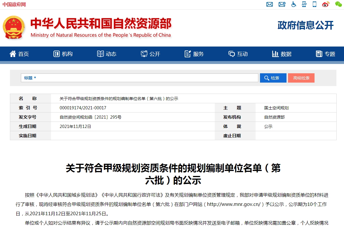 按照《中华人民共和国城乡规划法》《中华人民共和国行政许可法》及有关规划编制单位资质管理规定,我部对申请甲级规划编制资质单位的材料进行了审核,现将经审核符合甲级规划资质条件的规划编制单位名单(第六批)在部门户网站(http://www.mnr.gov.cn/)予以公示,公示期为10个工作日,从2021年11月12日至2021年11月25日。
