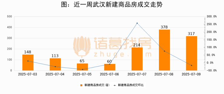 根据武汉市住房保障和房屋管理局数据显示,2025年07月09日武汉新建商品房成交317套,较昨日减少61套,环比下降16.1%。近一周武汉新建商品房日均成交185套。07月09日单日成交317套,高于近一周平均水平71.4%。