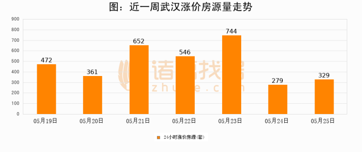 根据诸葛找房数据显示,武汉24小时涨价房源量为329套,较05月24日增加50套,环比上涨17.9%。与此同时,涨价房源占比小幅扩大,业主信心有所提升。