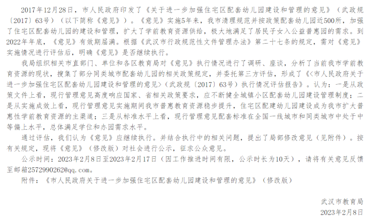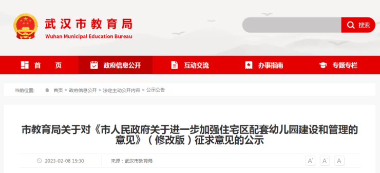 近日,武汉市教育局官网发布了市教育局关于对《市人民政府关于进一步加强住宅区配套幼儿园建设和管理的意见》(修改版)征求意见的公示。原文如下: