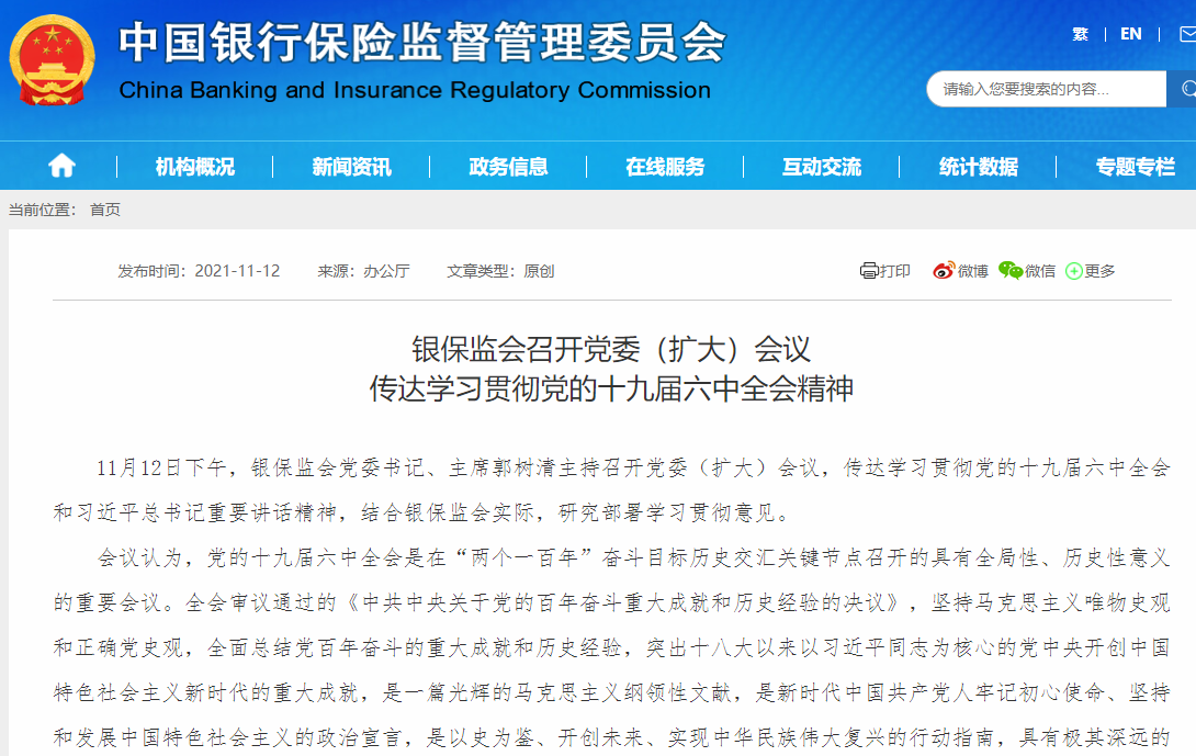 11月12日下午,银保监会党委书记、主席郭树清主持召开党委(扩大)会议,传达学习贯彻党的十九届六中全会和习近平总书记重要讲话精神,结合银保监会实际,研究部署学习贯彻意见。