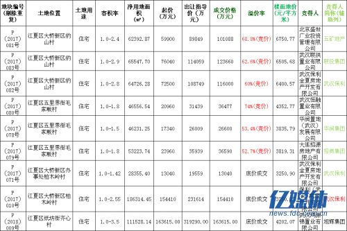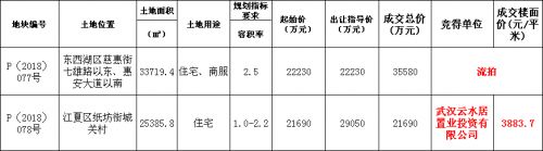 P(2018)078号江夏区纸坊街城关村地块,以21690万元底价成交,成交楼面价3883.7元/平米。竞得单位:武汉云水居置业投资有限公司。