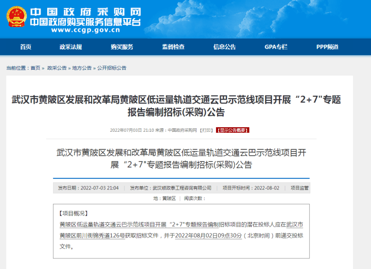 7月6日消息,搜狐焦点获悉,近日,多位网友在城市留言板上咨询黄陂区是否会规划新的地铁线路或空轨?好消息来了!7月3日,在中国政府采购官网上,《武汉市黄陂区发展和改革局黄陂区低运量轨道交通云巴示范线项目开展“2+7”专题报告编制招标(采购)公告》(以下简称《公告》)发布。