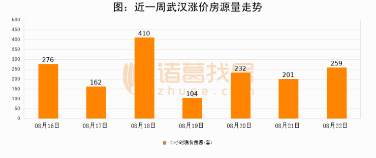 根据诸葛找房数据显示,武汉24小时涨价房源量为259套,较08月21日增加58套,环比上涨28.9%。与此同时,涨价房源占比小幅扩大,业主信心有所提升。
