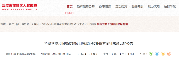 近日,武汉市汉阳区人民政府官网发布《桥梁学校片旧城改建项目房屋征收补偿方案征求意见的公告》,意见征求时间为2023年1月10日—2月9日,具体内容如下: