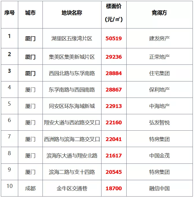 表:全国住宅用地楼面单价TOP10(全市口径数据)