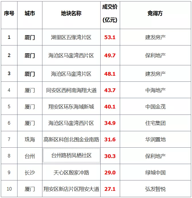 表:全国住宅用地成交总价TOP10(全市口径数据)