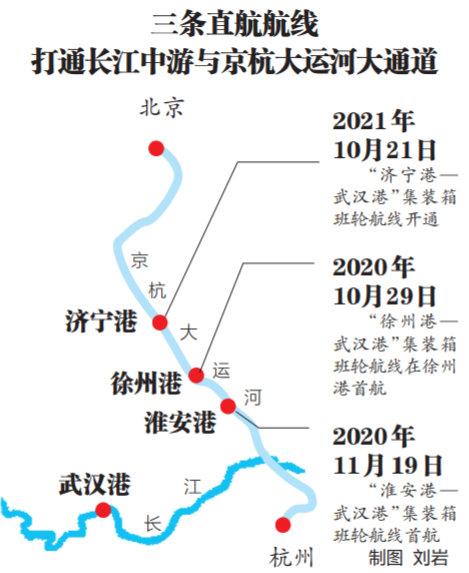 “济宁港—武汉港”集装箱航线,跨越了山东、江苏、安徽、江西、湖北五省,从济宁直航武汉大约需要11天时间,比原来中转运输模式节约3至5天时间。