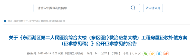 关于《东西湖区第二人民医院综合大楼(东区医疗救治应急大楼)工程房屋征收补偿方案(征求意见稿)》