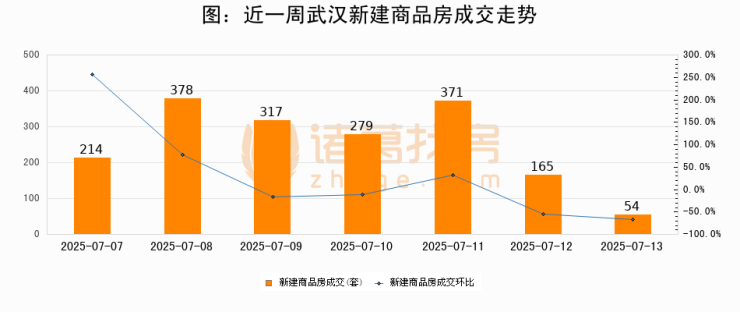 根据武汉市住房保障和房屋管理局数据显示,2025年07月13日武汉新建商品房成交54套,较昨日减少111套,环比下降67.3%