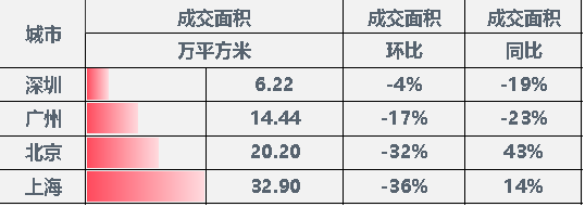 ▌一线城市:整体成交下降,上海降幅较大上周一线城市整体成交环比下降29.8%,上海降幅较大,约为36.2%;北京居其次,降幅约为31.6%。同比来看,楼市整体成交上升,升幅为6.2%。其中,北京升幅较大,约为43%;上海居其次,上升14.3%。