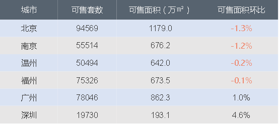 ▌库存:库存总量微幅下滑,北京降幅明显监测的6个代表城市库存环比整体下降0.20%。监测的城市中,北京库存降幅较大,约为1.3%,南京降幅为1.2%,位列第二,温州降幅为0.2%,位列第三;监测的城市中,仅广州和深圳库存环比有所上升,分别为1.0%和4.6%。