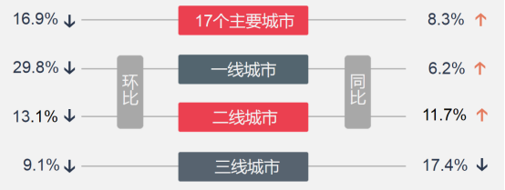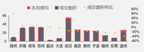 ▌二三线城市:近7成城市成交环比下降,温州降幅明显二线代表城市环比下降13.1%,同比上升11.7%。环比下降的城市中,温州降幅显著,约为39.85%;福州居次位,降幅为24.2%。三线代表城市成交量环比下降9.1%,东莞降幅较大,约为25.1%。同比来看,三线代表城市整体下降17.4%。
