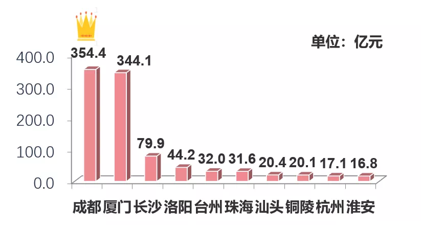 ▌出让金:榜单总额环比下降,成都收金逾354亿元居首