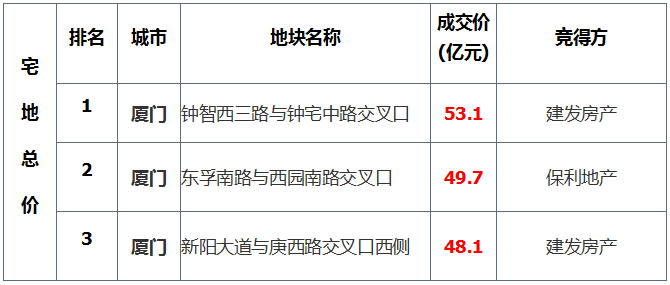 ▌宅地总价:榜单总额走低,厦门一城占据榜单七席全国住宅用地成交总价三甲