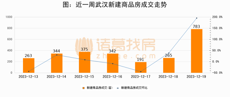 根据武汉市住房保障和房屋管理局数据显示,2023年12月19日武汉新建商品房成交783套,较昨日增加518套,环比上涨195.5%