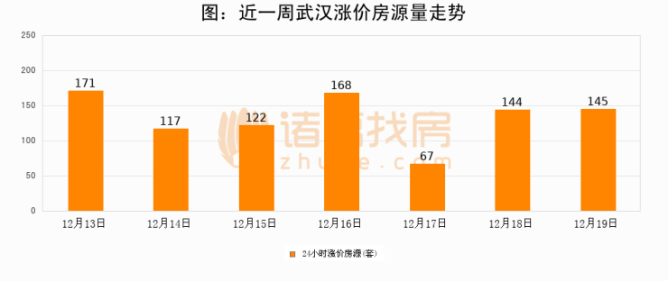 根据诸葛找房数据显示,武汉24小时涨价房源量为145套,较12月18日增加1套,环比上涨0.7%。与此同时,涨价房源占比小幅扩大,业主信心有所提升。