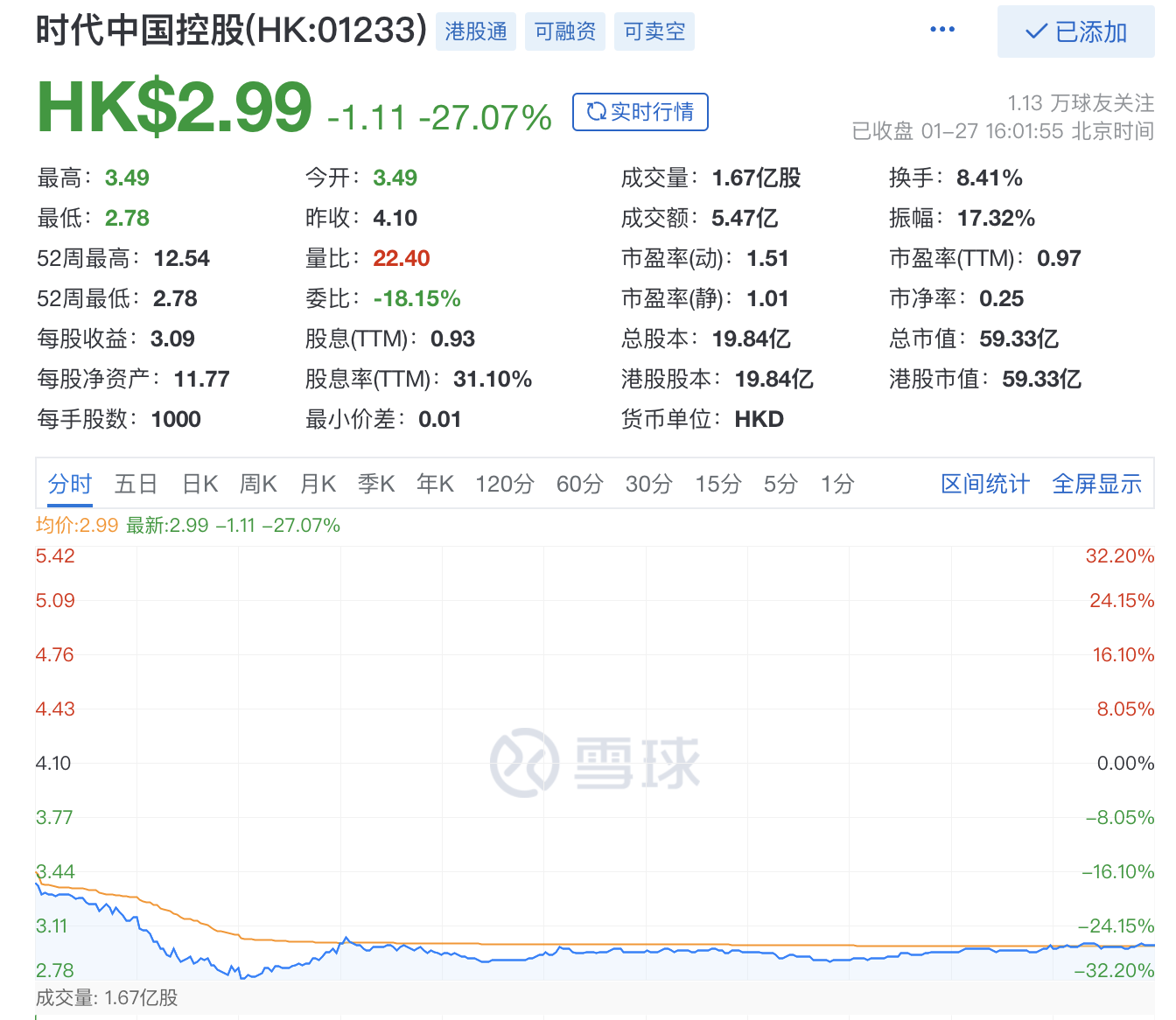1月27日,时代中国控股(01233.HK)大幅低开,股价一路走低,盘中较大跌幅达到31.95%。截至收盘,股价报2.99港元,跌27.07%。